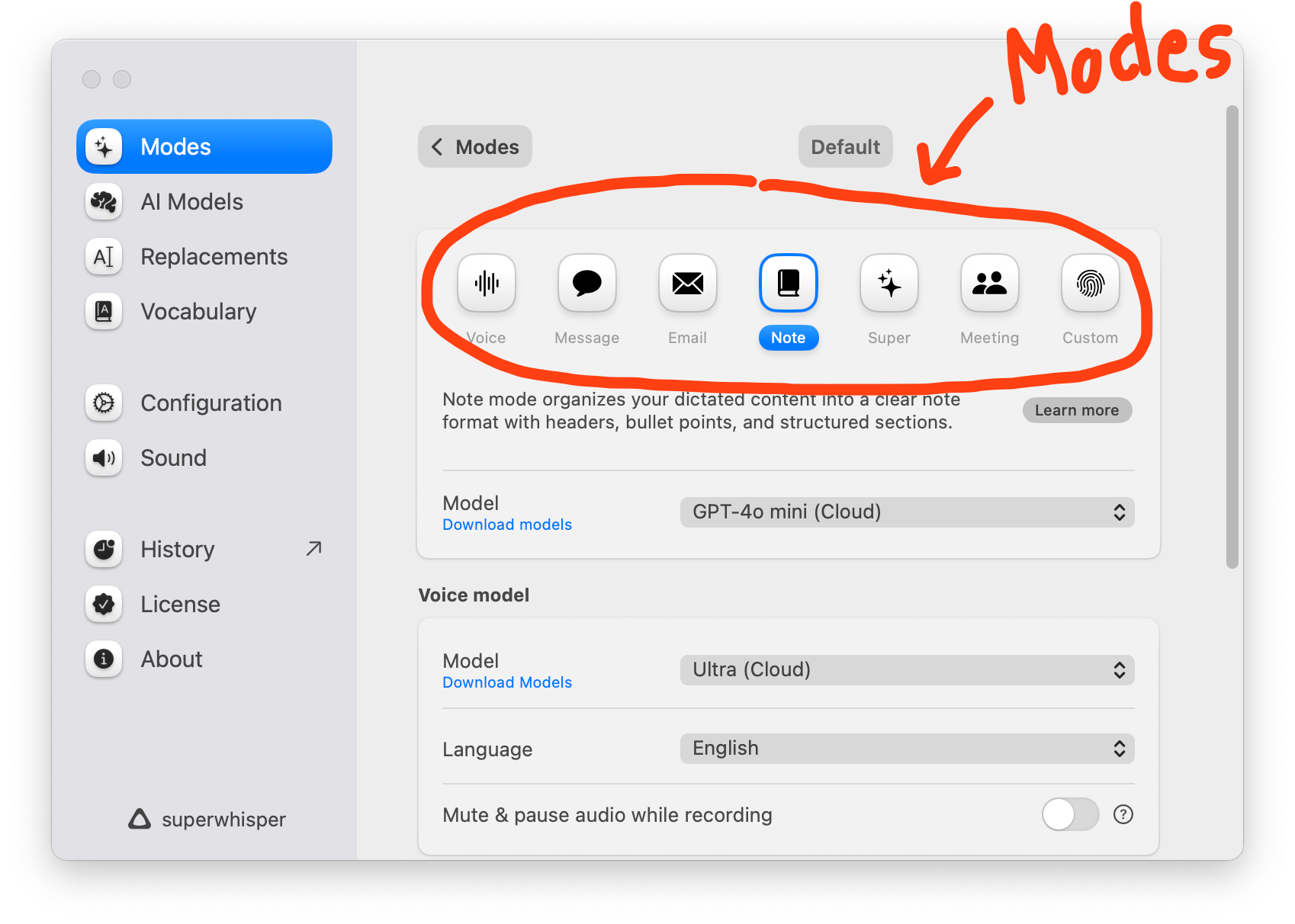 To make your transcript more useful, you can select a mode that structures what you said based on your use case. The idea is to send the transcript to OpenAI (or similar) for refinement.