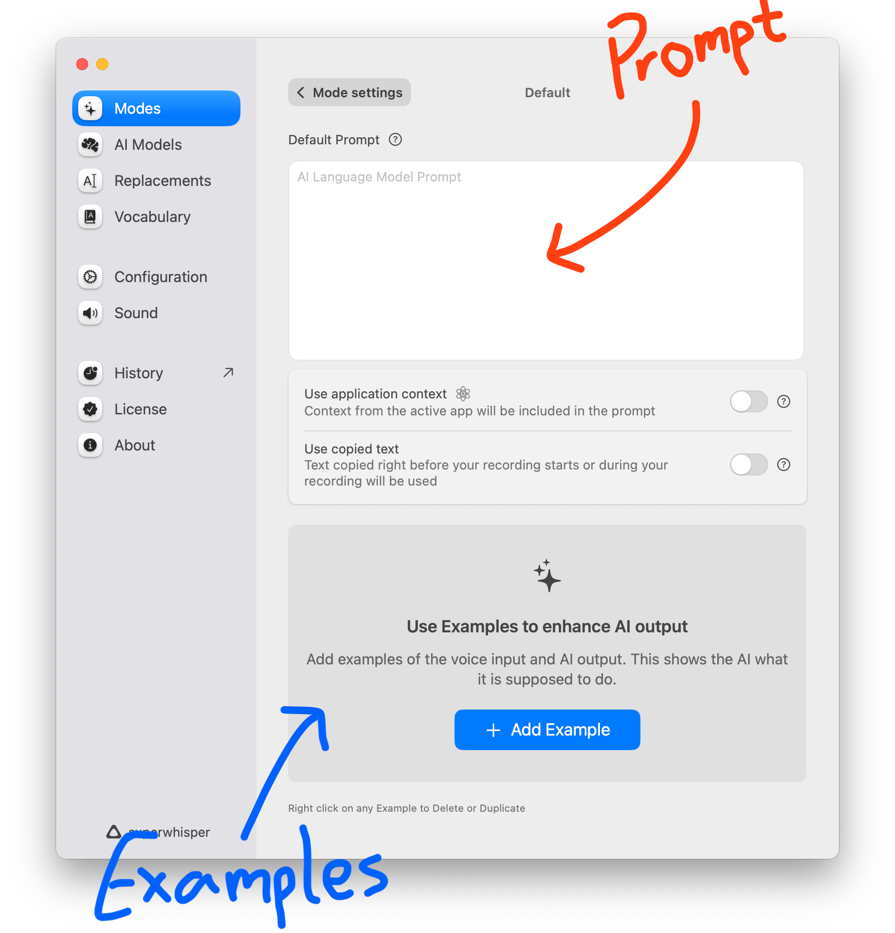 You can also create custom modes for more control. This adds the "Change Prompt" option, where you can tell the AI what to do with your transcript and if it should have access to the context of the current application and the content of your clipboard.