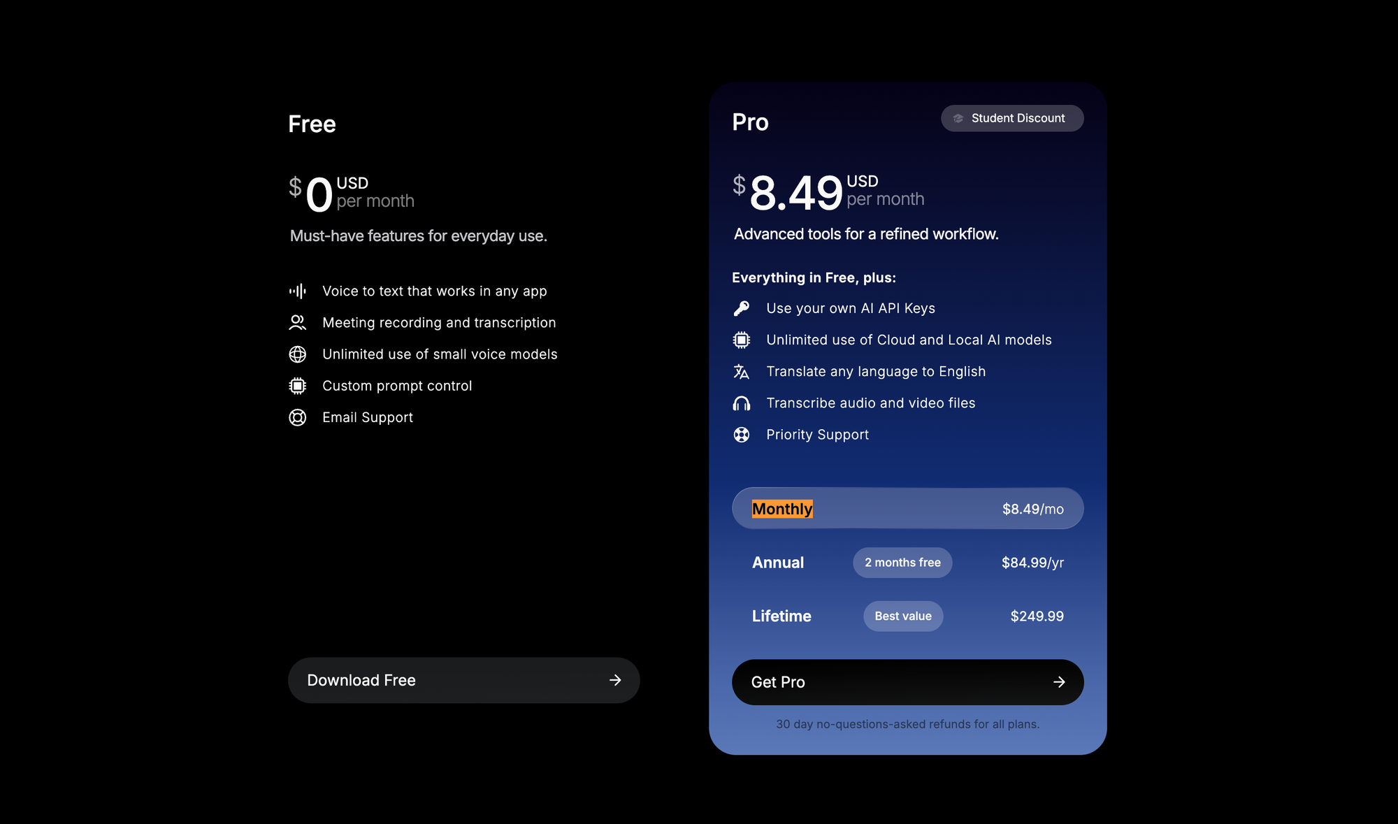 You can use Superwhisper Pro for free for 15 minutes of audio. If you want to continue using the Pro features, it costs $8.49 per month or $84.99 per year.